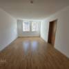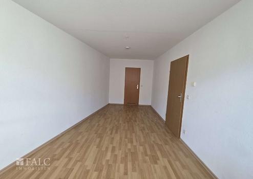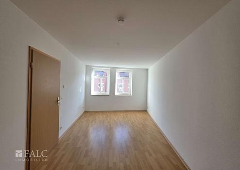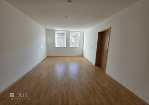 Das Wohnzimmer wirkt durch zwei Fenster freundlich und bietet genug Stellfläche für Sofa, TV und einen Esstisch. Der Laminatboden sorgt für eine warme Optik und ist im Familienalltag unkompliziert.