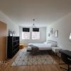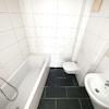 Das Schlafzimmer ist ruhig geschnitten und bietet Platz für ein Doppelbett sowie Kleiderschrank. Angrenzend befindet sich das Badezimmer mit modernen Fliesen, einer Badewanne, WC und Waschbecken.
