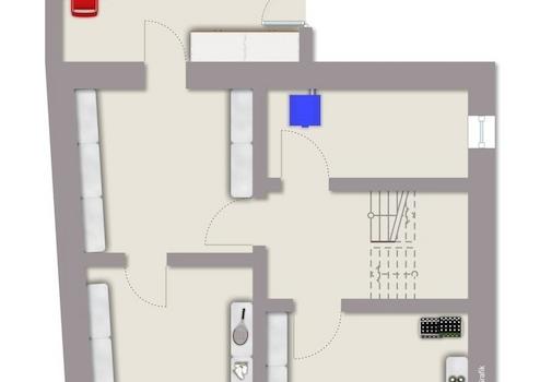 Das Erdgeschoss verfügt über ein Wohnzimmer, Küche, Tageslichtbad und zwei Schlafzimmer mit einer Wohnfläche von 72m². Zusätzlich ist im Rahmen des Anbaus ein weiterer großzügiger, ebenerdiger Raum entstanden, der beispielsweise als Werkstatt genutzt werden kann.