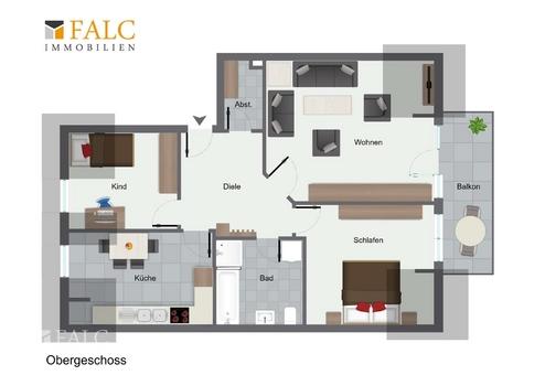 Sie betreten die Wohnung über einen zentralen Eingangsbereich, der Platz für Garderobe und Schuhschrank bietet und die Räume sinnvoll miteinander verbindet. Von hier aus gelangen Sie ohne Umwege in den Wohnbereich, der als Mittelpunkt des Alltags funktioniert. Der Raum ist gut geschnitten und lässt sich flexibel möblieren, etwa mit einer Sofaecke und einem Esstisch in angenehmer Nähe zur Küche. Große Stellflächen an den Wänden erleichtern die Einrichtung und schaffen Ordnung.
