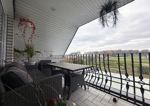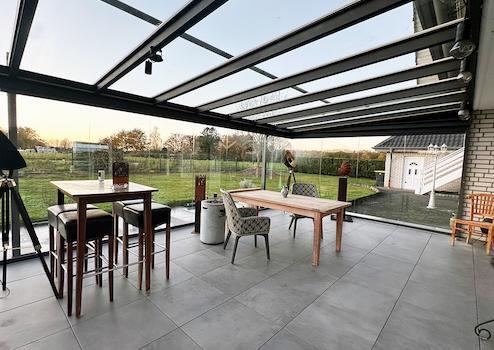 Die große Terrasse wurde um 2019 mit neuen Bodenbelägen versehen und durch Fensterelemente überdacht bzw. geschlossen. Entstanden ist ein schöner Bereich, der zum Verweilen und Genießen in direkter Naturnähe einlädt.