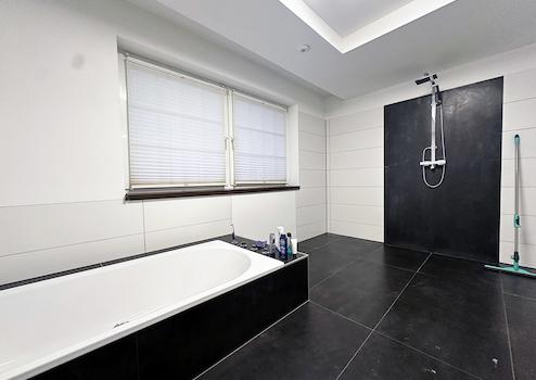 Wohnzimmer mit angrenzender offener Küche und Terrassenzugang, Schlafzimmer (mit Ankleide), Arbeitszimmer, Diele, Gäste-WC, Bad (mit Wanne und Dusche)