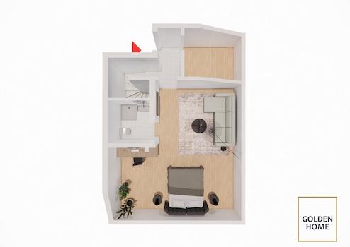 Die obere Ebene ist sowohl über eine interne Treppe als auch über einen separaten Zugang erreichbar. Hier stehen ein großzügiges Studio, ein Duschbad und ein Abstellraum zur Verfügung, wodurch vielfältige Nutzungsmöglichkeiten gegeben sind.