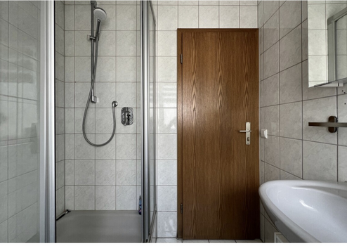 Das Tageslichtbad ist mit einer Eckdusche, WC und Waschbecken ausgestattet.
