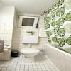 Das Badezimmer ist klassisch gefliest und mit einer Badewanne ausgestattet. Ein zentraler Flur verbindet alle Räume und bietet zusätzliche Stellflächen für Garderobe oder Stauraum.