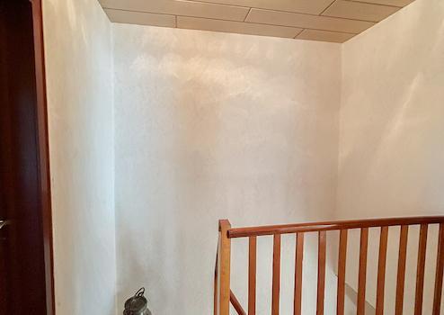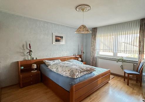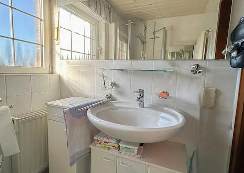Das Obergeschoss besteht aus einem Elternschlafzimmer, zwei Kinderzimmern und einem hellen Badezimmer. Das Bad ist mit einem Waschbecken, einer Dusche mit Glaselementen und einem Hänge-WC ausgestattet, deckenhoch gefliest und mit Feuchtraumpaneelen sowie Einbaustrahlern versehen.