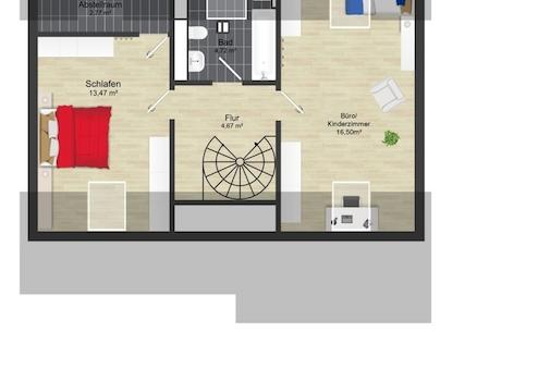 Über eine innenliegende Wendeltreppe erreichen Sie das Dachgeschoss, das als privater Rückzugsbereich dient. Hier stehen ein Schlafzimmer mit ca. 13,47 m² sowie ein weiteres Zimmer mit ca. 16,50 m² zur Verfügung, das flexibel als Homeoffice, Gäste- oder Hobbyraum genutzt werden kann. Ein praktischer Abstellraum sorgt für zusätzlichen Stauraum. Das zweite Badezimmer ist als Wannenbad ausgeführt und bietet Platz für eine Waschmaschine. Dachflächenfenster sorgen für viel Tageslicht und unterstreichen den luftigen Charakter dieser Ebene.