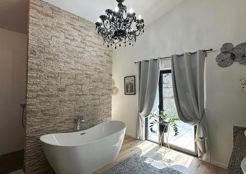 Über eine Treppe gelangen Sie ins Obergeschoss, wo Sie ein großzügig gestalteter, offener Wohnbereich empfängt – mit direktem Zugang zur Terrasse und zum angrenzenden Pool. Ein zusätzliches Kinder- oder Arbeitszimmer sowie eine elegante Suite mit Schlafbereich, Ankleide und einem Bad, das sowohl eine Badewanne als auch eine Dusche bietet, vervollständigen diese Ebene.