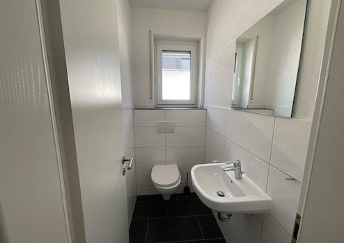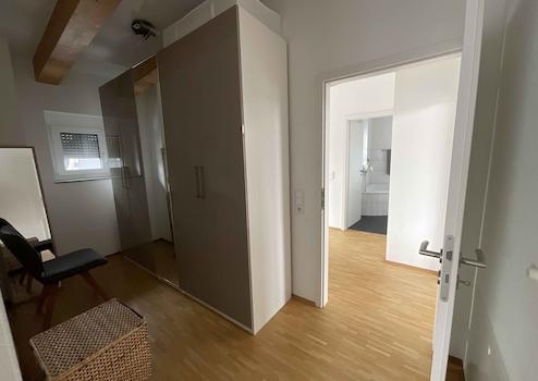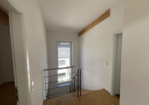 Nach Eintritt in die Wohnung befinden Sie sich im großzügigen Eingangsbereich, der ausreichend Platz für eine Kommode oder gar einen Büro-Arbeitsplatz bietet. Auch das separate Gäste-WC befindet sich hier. Moderne helle Fliesen und ein Fenster geben diesem Bereich das entsprechende Flair. Anschließend geht es über eine Treppe nach oben in den restlichen Wohnbereich. Nach Erreichen der Etage befindet sich linker Hand das freundliche Tageslichtbad, welches mit Dusche, Badewanne, WC und Waschbecken ausgestattet ist. Die dunklen Boden- und die hellen Wandfliesen ergänzen mit dem großen Fenster den Charme dieses Bereiches. Gegenüberliegend befindet sich das Schlafzimmer, dem eine Ankleide vorsteht. Im Schlafzimmer bringen Sie bequem eine Doppelbettanlage unter und können beim Frühstück im Bett auf die Dachterrasse blicken. Zuletzt betreten wir gedanklich den offenen und hellen Tagesbereich. Wohnen, Essen und Kochen gehen hier wunderbar Hand in Hand über und werden praktisch durch einen Abstellraum ergänzt. Der Raum ist außerdem ausreichend groß gestaltet, dass Sie problemlos diverse Einrichtungsvarianten vornehmen können. Die vorhandene und hochwertige Einbauküche ist bereits im Kaufpreis enthalten. Direkt nebenan befindet sich ein separater Abstellraum (innenliegend) in dem nicht nur die Bevorratung ihren Platz findet. An sonnigen Tagen bietet es sich an, die Dachterrasse zu nutzen. Dank der außergewöhnlichen Architektur des Hauses ist diese abgerundet und bietet einen besonderen Ausblick mit vielen Sonnenstunden; sie ist nach Süden und Westen ausgerichtet.