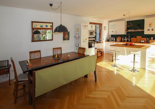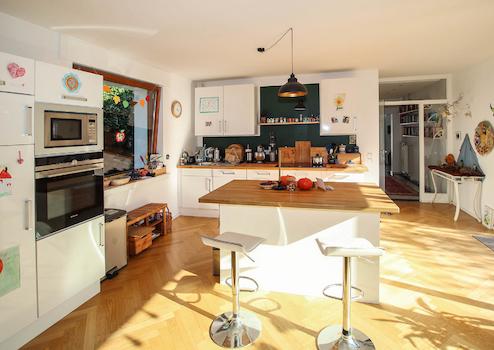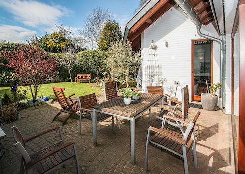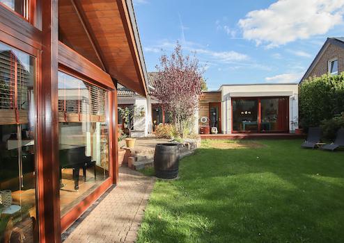 Das Highlight ist der über 85 m² große Wohn- und Essbereich mit bodentiefen Fensterfronten und einer Raumhöhe von bis zu 5 m. Sonnenterrasse und Garten sind sowohl aus den Wohn- als auch den Schlafräumen erreichbar. Der liebevoll angelegte, harmonisch eingewachsene Garten ist ein Traum. Hier können Sie zu jeder Tageszeit die Seele baumeln lassen.