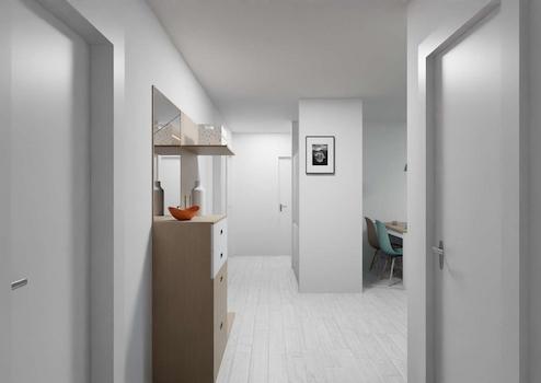 Durch die Eingangstür betreten Sie den mit Teppich ausgelegten Flurbereich, von dem aus klassischerweise alle Zimmer abzweigen. Im Flur ist ein großer Einbauschrank mit reichlich Stauraum verbaut.