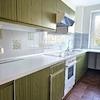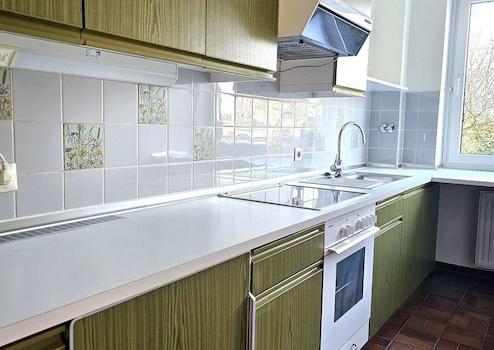 Die helle Einbauküche birgt genügend Platz zum gemütlichen Kochen. Auch fände hier ein kleiner Essplatz Raum.