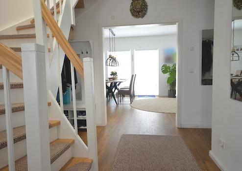 4,5 Wohn-/Schlafräume, Original Schwedenhaus, großer Wohnbereich, großer und heller Essbereich im Wohnzimmer, große Wohnküche, Duschbad mit WC, großes Vollbad im Obergeschoss, alle Räume haben Premium Designerböden oder hochwertige italienische Fliesen, alle Fenster mit maßgefertigten Lamellen-Holz-Shutter und 3-fach Isolierverglasung, 3 zusätzliche Veluxfenster zur Sonnenseite mit elektrischen Außenrollladen, teilweise Außen-/ Fenstermarkisen, Kaminvorbereitung, superschnelles Internet (Glasfaser), moderne Gas-Heizung, alle Räume mit Fußbodenheizung, Eingangsbereich mit Holz-Veranda, große Terrasse mit Blick in den Garten, TOP ruhige aber zentrale Lage, 2 Garagen und mehrere Stellplätze, Solarthermie Anlage für die kostenlose Warmwasseraufbereitung, Kameraüberwachungssystem und Alarmanlage, Whirlpool, Nähe zum Naturschutz- und Waldgebiet, zentrumsnah