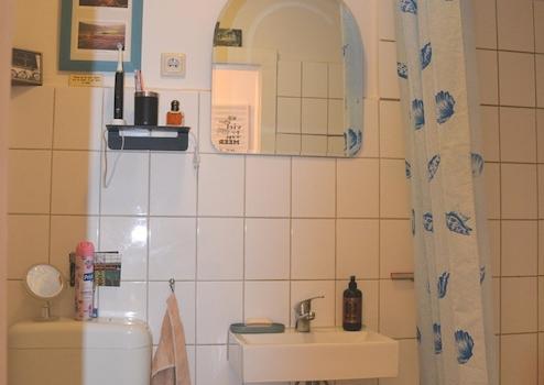 Das innenliegende Badezimmer ist neutral weiß gefliest und mit einer Badewanne ausgestattet.