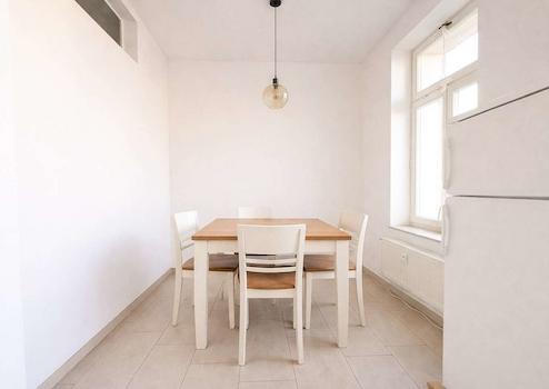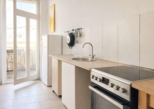 Die großzügige Küche bietet ausreichend Platz für einen Essbereich und wird durch den direkten Zugang zum großen Balkon ergänzt. Dieser ist zum ruhigen Innenhof ausgerichtet und lädt zum Verweilen im Freien ein.