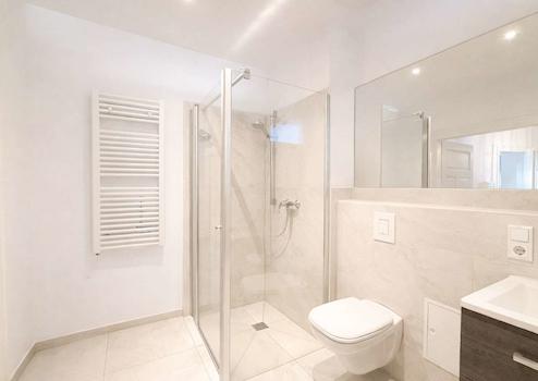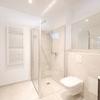 Das Badezimmer wurde ebenfalls im Rahmen der Sanierung 2015 erneuert und präsentiert sich in einem modernen, zeitlosen Stil mit hochwertigen Fliesen in Marmoroptik. Ausgestattet ist es mit einer bodengleichen Dusche, einer großen Badewanne, einem Waschbecken mit großzügigem Spiegel sowie einem Waschmaschinenanschluss. Ein seitliches Fenster sorgt für angenehmes Tageslicht. Zusätzlich erhöhen ein Handtuchheizkörper sowie integrierte Deckenspots den Komfort.