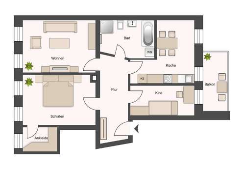 Hinweis: Die Wohnungsbilder wurden im derzeit bewohnten Zustand aufgenommen und mittels KI digital beräumt. Die Raumaufteilung wurde originalgetreu übernommen.