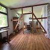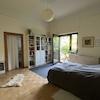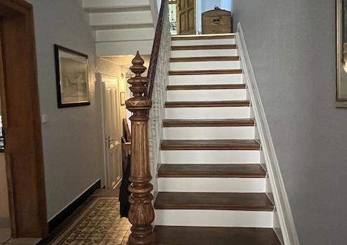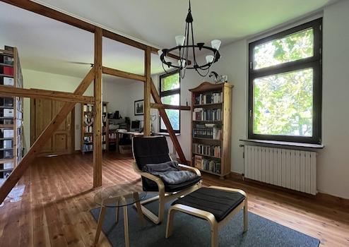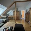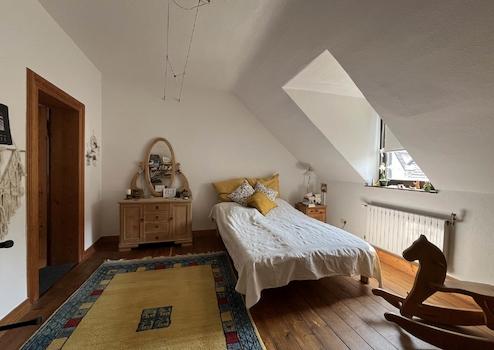 Über eine schöne Holztreppe gelangt man ins Obergeschoss mit Schlafzimmer, Balkon, Duschbad, Kinderzimmer, einem gefangenen Raum (z. B. Büro oder Ankleide) sowie einem großen Arbeitszimmer im Anbau.