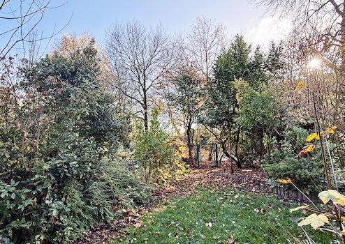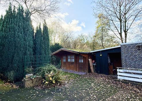 Zum Haus gehört eine Garage, die einen Zugang zur Terrasse hat. Im eingefriedeten Garten steht ein größeres Gartenhäuschen.
