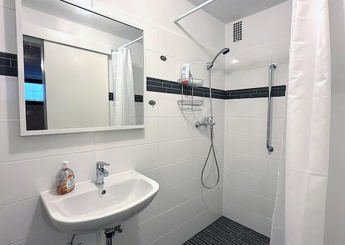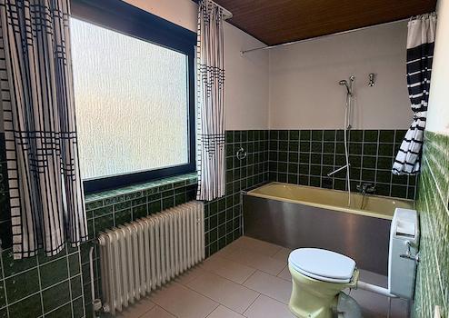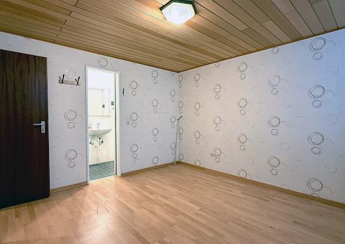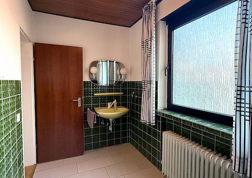 Der größere Raum (Grundriss III) verfügt über ein integriertes Bad mit Dusche und Waschbecken. Ebenfalls auf dieser Ebene sind der Hauswirtschaftsraum (Grundriss: Installationskeller) sowie ein weiterer Raum mit Zugang über die Kelleraußentreppe in den Garten.