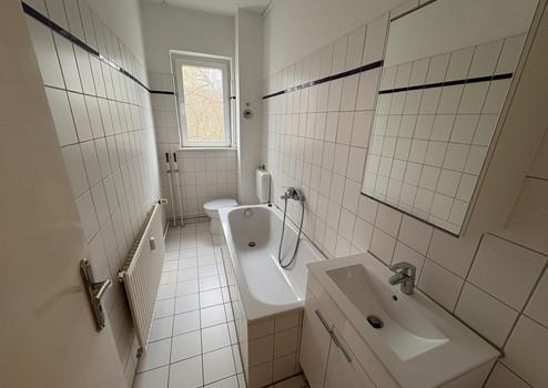Die Küche ist funktional geschnitten, das Badezimmer ist klassisch gefliest und mit Badewanne ausgestattet. Ein gepflegter Laminatboden rundet den soliden Gesamteindruck ab.