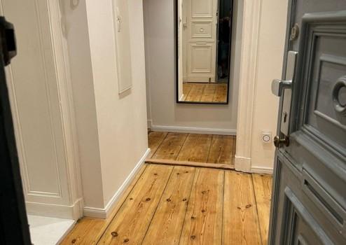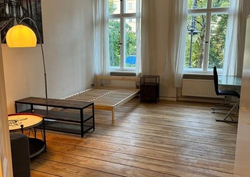 Das Zimmer liegt in der ersten Etage Vorderhaus zur Gneisenaustraße und verfügt über den typischen Altbaustil des 19. Jahrhunderts.