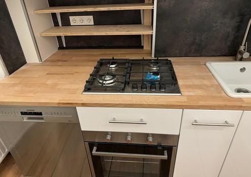 Die Wohnung selbst verfügt über eine Einbauküche mit Herd, Spülmaschine, Backofen und Kühlschrank.