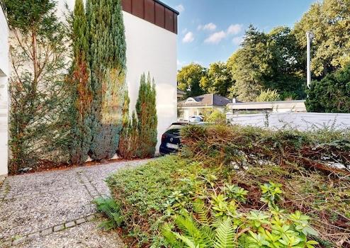 Grenzständiges, freistehendes Einfamilienhaus mit unabhängiger Einliegerwohnung in einer ruhigen Wohnstraße mit Ziegelpflasterbelag. Gepflegtes Wohnumfeld gehobenen Bürgertums.