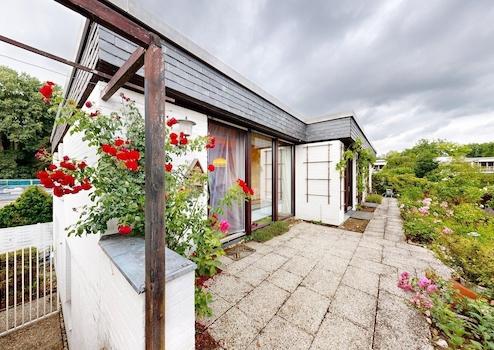 Einfamilienhaus 175m² Eingang im EG, Hauptwohnfläche auf Gartenebene im OG. Die erdgeschossige Einliegerwohnung ca. 57m² verfügt über einen eigenem Eingang. Fassade weiß geschlämmtes Sichtmauerwerk. Attika Naturschieferbekleidung. Geschossdecke Stahlbeton, Flachdach gedämmte Holzbalkenlage mit bituminöser Abdichtung . Dach vor einigen Jahren umfassend saniert u. aktuell hat ein Dachdecker dem Dach einen guten Zustand bescheinigt! Zusätzliche 36m² geschützte Terrasse auf dem Garagendach als Erweiterung der oberen Gartenebene.