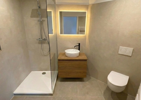 Ausstattung: Hochwertiger Vinyl-Boden in heller Eichen-Optik, moderne Spot-Beleuchtung, neue Elektrik im schwarzen Design, moderne Türen und frisch saniertem Bad mit moderner Dusche, LED Spiegel und Waschtisch.