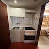 Die Küchenzeile, die sich direkt hinter der Eingangstür befindet, ist mit einem Backofen, einem Herd sowie einem Spülbecken ausgestattet. Das angrenzende Badezimmer ist vergleichsweise großzügig und verfügt über ein Waschbecken, ein WC sowie eine Badewanne.
