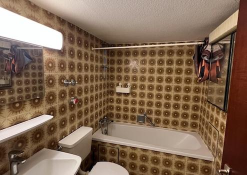 Die Einheit befindet sich in einem baujahrtypischen Zustand. Die Fenster wurden vor einigen Jahren erneuert und verfügen über doppeltverglaste Kunststoffrahmen. Der funktionale Grundriss umfasst einen Wohn- und Schlafbereich, eine direkt hinter der Eingangstür platzierte Küchenzeile sowie ein vergleichsweise großzügiges Badezimmer mit Waschbecken, WC und Badewanne.