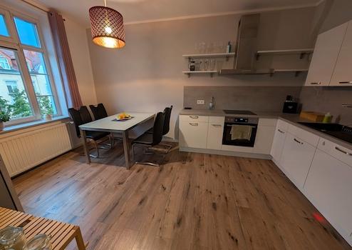 •Küche: Moderne Einbauküche mit Herd, Geschirrspüler, freistehendem Kühlschrank, Mikrowelle, Esstisch mit 4 Stühlen