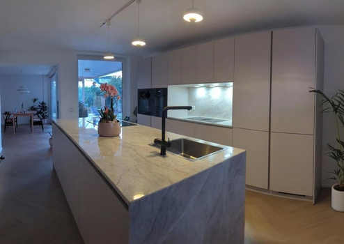 Profi-Küche: Große Küche mit einer Echtstein-Kochinsel und hochwertigen Miele-Geräten.