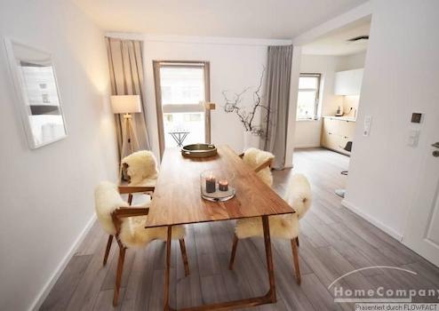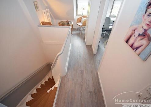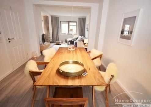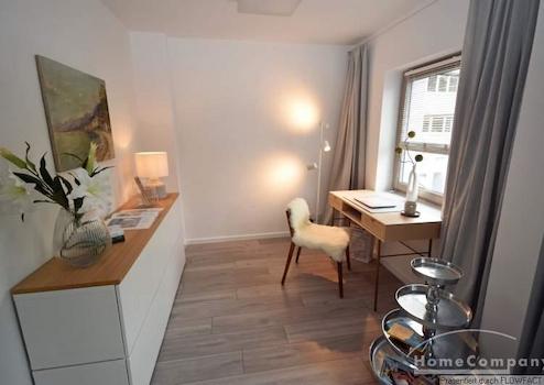 Diese TOP-Wohnung wurde vor 2 Jahren komplett sanierts und neu möbliert. Die sehr geschmackvolle moderne Möblierung und das offene Wohnen, gibt dem Ganzen ein ganz besonderes Ambiente. Die Räume befinden sich auf 2 Etagen. Im 1. OG befindet sich der gemütliche Wohnbereich mit einer Couchgarnitur. In einer Nische liegt der offene Arbeitsbereich. Ein großer Esstisch für 4 Personen schließt sich dem Wohnbereich an. Der vorgelagerte Balkon liegt zum Innenhof. Alter Baumbestand und die Bepflanzungen in den Gärten, lassen die Gartenzeile sehr idylisch wirken. Die Anschließende, voll ausgestattete Küche überzeugt durch Ihre klare Linie. Im Flur befindet sich ein Gäste-WC und die Treppen zum Obergeschoß. Hier finden wir das moderne Badezimmer mit Dusche, das Schlafzimmer und das Gästezimmer mit einem ausziehbaren Bett. Die Wohnung ist für 2 Kollegen oder eine Familie mit Kind geeignet.