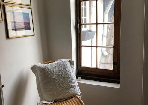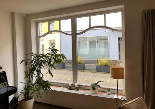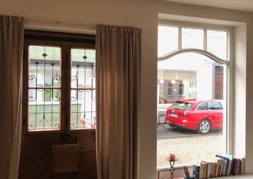 Zur Straße hin befinden sich im Erdgeschoss drei große doppelverglaste Holz-Fenster, die denen des ursprünglichen Ladens nachempfunden und vom Schreiner neu gebaut wurden.