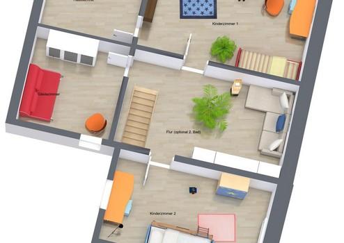 In der 2. Etage gibt es einen offenen Büro-/Wohnraum, in dem die sanitären Installationen für ein zweites Bad vorbereitet sind. Ein weiteres Schlafzimmer, ein Gästezimmer und den Heizungsraum ergänzen die Etage.