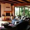 Erdgeschoß - Wohnzimmer mit Kamin, Zugang zur Terrasse und zum Garten, Esszimmer, offen zur Küche, WC und Balkon in den Wintergarten.