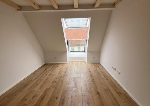 Der Rohdachboden wurde mit viel Liebe zum Detail zu einer hochwertigen neuen Wohnung ausgebaut. Vom neu gestrichenen Treppenhaus des Gemeinschaftseigentums gelangt man über einen Flur direkt in die Wohnung. Dabei fällt sofort der harmonische Mix aus den Sichtbalken und dem hochwertigen Laminat auf. Gegenüberliegend von der Eingangstüre befindet sich direkt eine kleine Nische, die sich ideal für eine Garderobe eignet. Dahinter findet man auf circa 4qm großzügigen Stauraum im Abstell- / Technikraum. Vom Flur gelangt man anschließend in ein circa 9qm großes, separates Zimmer. Dieses eignet sich ideal als Büro oder Schlafzimmer. Ebenfalls über den Flur wird das helle, circa 5qm große Tageslichtbad betreten. Das Bad besticht durch eine moderne Gestaltung mit großen Bodenfliesen, einem hochwertigen Duschsystem von Hans Grohe und einem exklusiven Waschbecken inklusive moderner Armatur. Das Badezimmer bietet zudem Platz für Ihren Trockner sowie die Waschmaschine. Absolutes Highlight der Wohnung ist der offen gestaltete Wohn- / Essbereich mit insgesamt circa 23qm. Die freiliegenden Balken sorgen für ein besonders wohliges Ambiente, bei dem die hohen Decken den Raum deutlich größer wirken lassen. Die beiden großen ausklappbaren Dachbalkone von Velux erweitern den Wohnraum besonders an sonnigen Tagen und bieten so einen der schönsten Plätze in Nürnbergs Südstadt. Eine Einbauküche kann vom Mieter selbst ausgesucht und eingebaut werden. In einer kleinen Nische finden Sie Platz für weiteren Stauraum oder zusätzliche Schrankmodule. Über die loftartige Treppe gelangt man ins große Studio mit über 13qm. Dieses bietet unzählige Möglichkeiten zur freien, kreativen Gestaltung. Die gesamte Wohnung wurde mit einer neu verlegten Fußbodenheizung ausgestattet, welche durch eine moderne Gasbrennwerttherme besonders energiesparend beheizt werden kann.