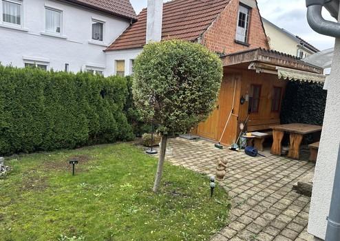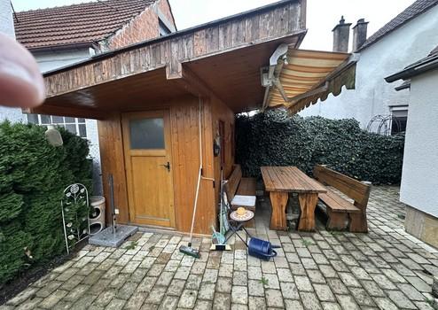 •Garten mit sanierter Gartenhütte und gemütlicher Sitzgelegenheit