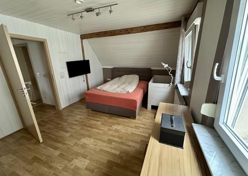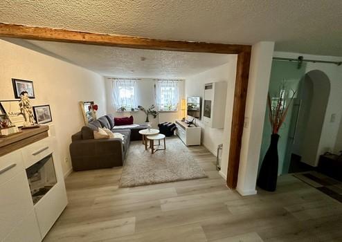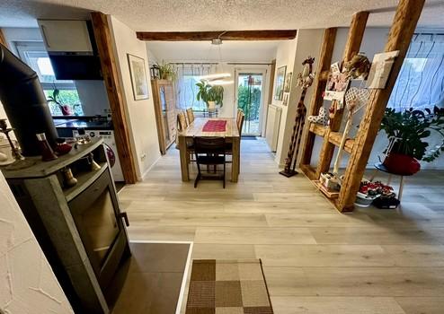 •Großzügiger Wohn- und Essbereich mit neuem Vinylboden (2025) und rustikalen Holzbalken