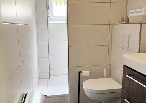 Direkt daneben befindet sich ein modernes Hänge-WC, das mittels einer Vorwandkonstruktion an der Südwand des Raumes installiert wurde. Der geflieste Absatz bietet Platz, um allerlei Nützliches und Dekoratives aufzustellen.