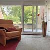 Der Raum wird beherrscht von einer großen Fensterfront mit Schiebetür, die sich über die gesamte Breite des Raumes erstreckt. Sie ist nach Süden ausgerichtet, sorgt - mit einem weiteren Fenster nach Osten - für beste Lichtverhältnisse und bietet einen herrlichen Blick in den Garten.