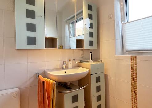 - An der Nordwand findet sich Platz für das Waschbecken, das von schicken Badmöbeln umbaut ist.