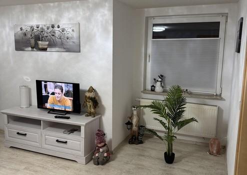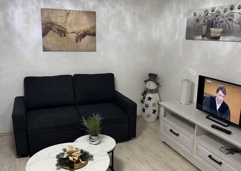 • Wohnen & Entspannen: Das helle Wohnzimmer lädt zum Verweilen ein. Ein großer TV ist ebenso vorhanden wie zwei ausziehbare Sofas, die zusätzliche Flexibilität bei der Nutzung bieten.