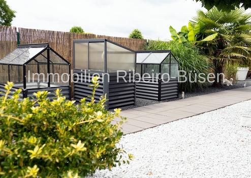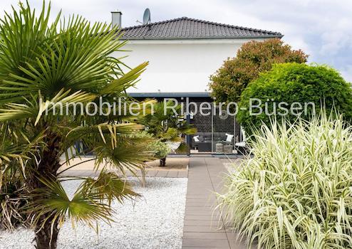 Auch der Garten des insgesamt 659 m² umfassenden Grundstücks setzt die Geradlinigkeit der Architektur mit Zen-Elementen ansprechend um. In der luftig und leichten Alu-Glaskonstruktion des Sommergartens genießen Sie auch an kühlen Tagen die schöne Aussicht.