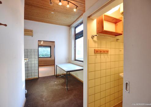 Im Erdgeschoss befindet sich die ehemalige Gewerbeeinheit, die sich aufgrund ihrer Raumstruktur auch gut für eine Umnutzung zu Wohnzwecken eignet. Ergänzend ist auf dieser Ebene bereits eine kleine separate Wohneinheit mit einem Zimmer, Duschbad und Pantry-Küche vorhanden.