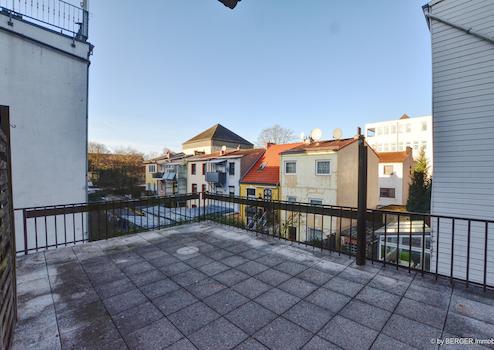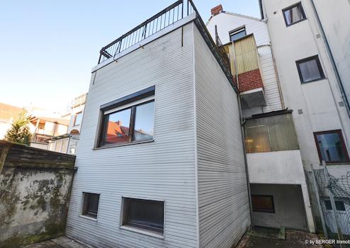 Das 1. Obergeschoss verfügt über eine weitere Wohneinheit mit einem großzügigen Zimmer zur Straße, einer Küche und einem Wannenbad. Ein zusätzliches Zimmer mit Zugang zur großzügigen Dachterrasse rundet diese Etage ab und schafft einen besonderen Mehrwert.