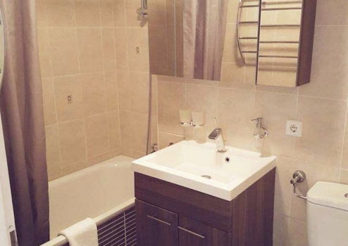 - renoviertes Bad mit Wanne, Waschbecken, WC, Spiegelschrank und Waschtisch,