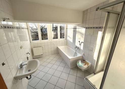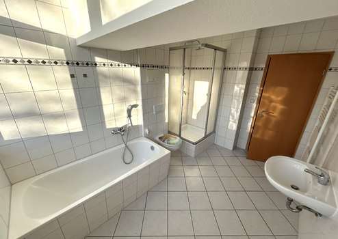 Ein weiteres Highlight der Wohnung ist das moderne Tageslichtbad, das sowohl mit einer Dusche als auch mit einer Badewanne ausgestattet ist. Helle Fliesen und ein großes Fenster sorgen für eine angenehme Atmosphäre und bieten beste Voraussetzungen für einen erfrischenden Start in den Tag oder ein entspannendes Bad am Abend.